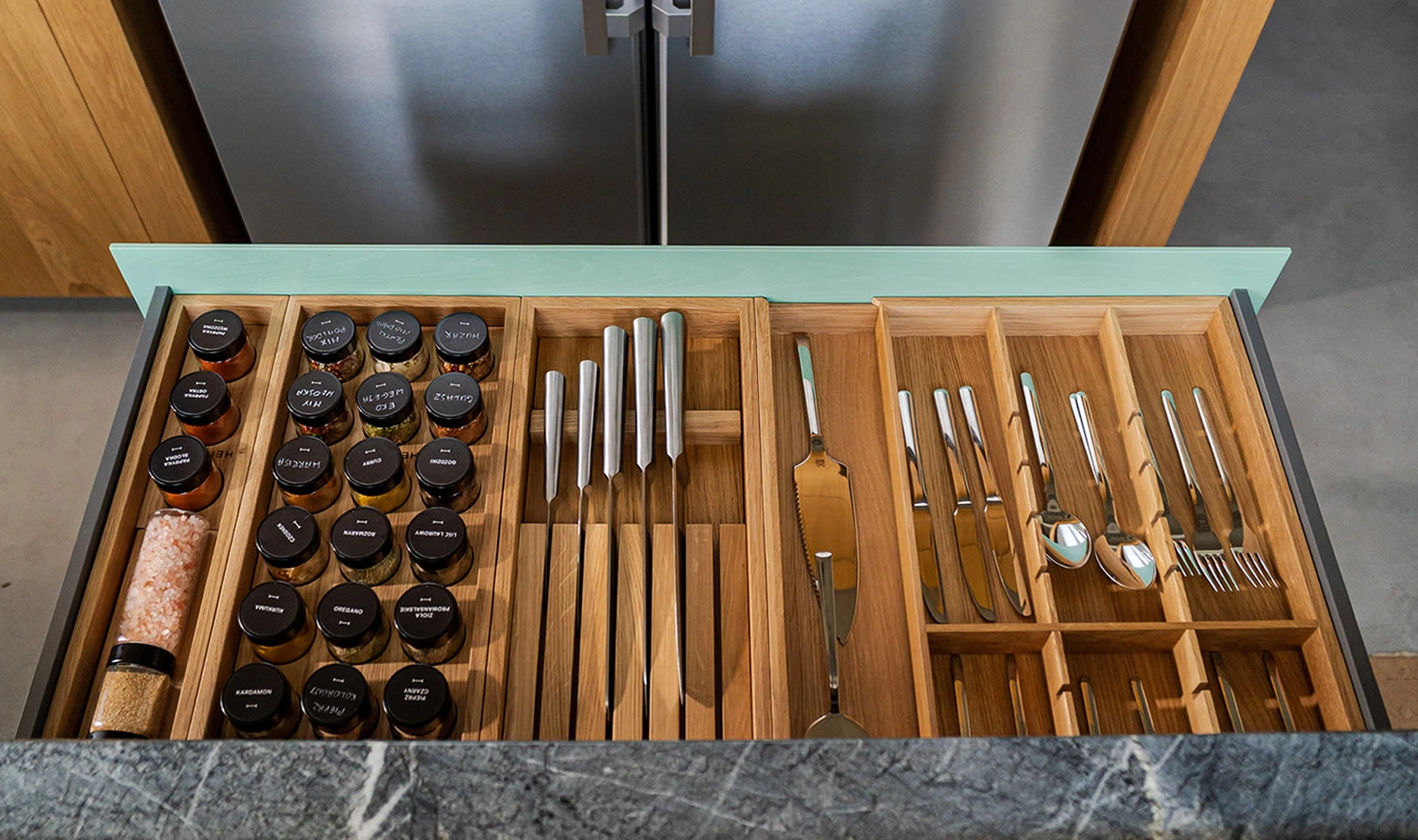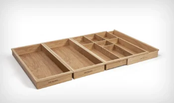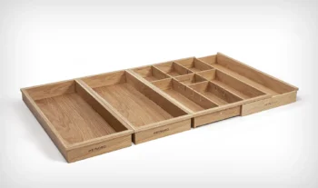 Jest wiele organizerów do szuflad kuchennych, ale naturalne, lite, dębowe drewno jest unikalnym materiałem w tym segmencie.