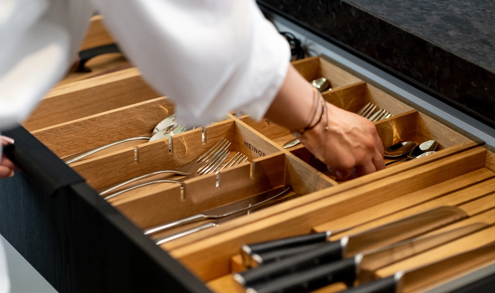 Jest wiele organizerów do szuflad kuchennych, ale naturalne, lite, dębowe drewno jest unikalnym materiałem w tym segmencie.